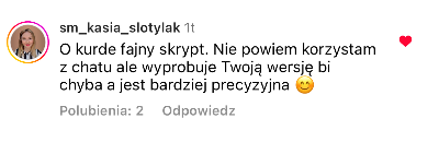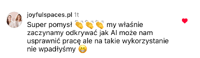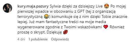 Na live pokazałam jak tworzyć taki podstawowy content, to było pod treści typu rolka czy post, a teraz pokażę Ci o wiele więcej zastosowań np.: precyzyjnie tworzenie treści typu BIO, tworzenie treści pod oferty, strony sprzedażowe, scenariuszy na rolki, video czy dłuższe filmy na YT. Pokażę Ci też, jak można z CHATU korzystać tak, aby się czegoś nauczyć, aby się zainspirować i wyznaczyć sobie precyzyjne cele.